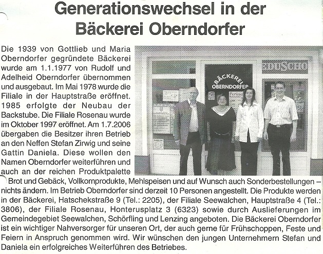 Am 1.Juli 2006 übernahm der Neffe Bäckermeister Stefan Zirwig mit Gattin Daniela die Bäckerei Oberndorfer.